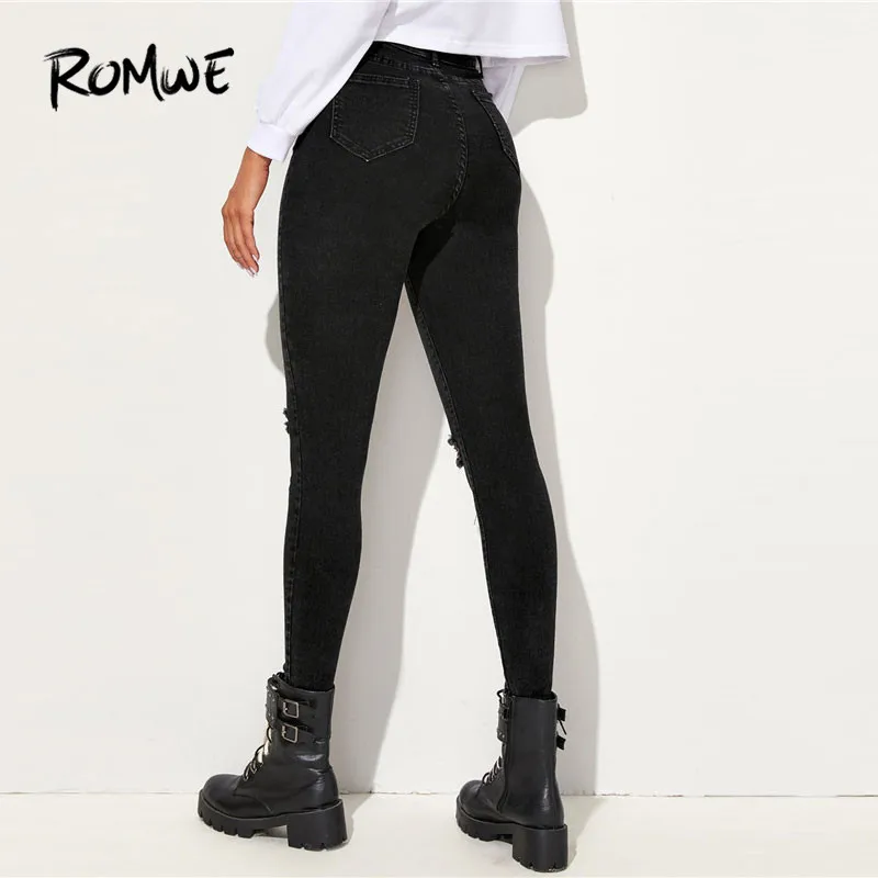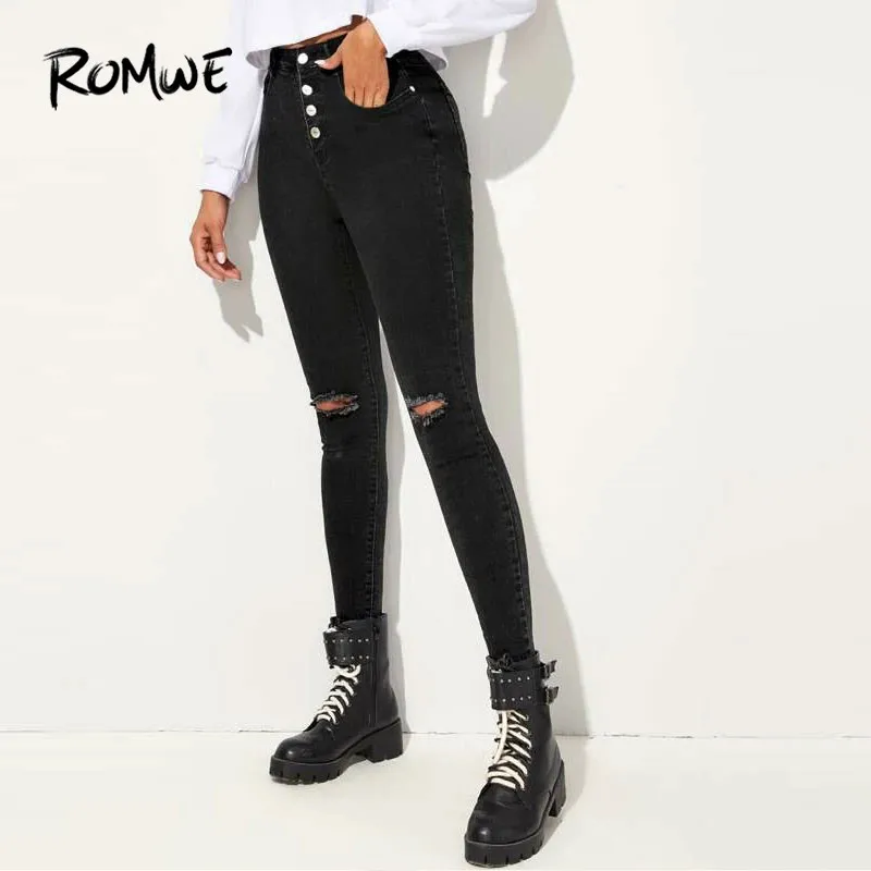 ROMWE Black Wash Ripped Skinny Jeans Woman Casual Solid Spring High Waist Jeans Vintage Denim Button Fly Ladies Jeans look the best product that related to