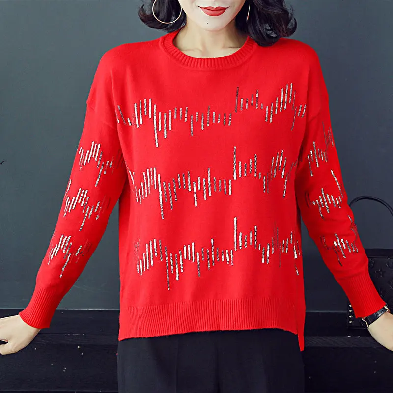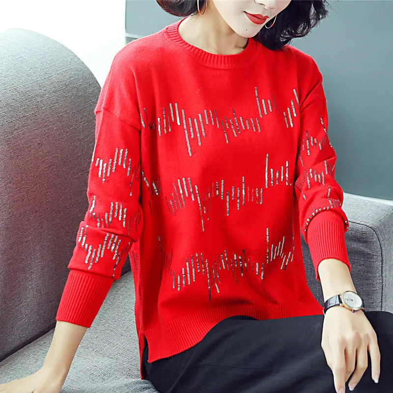 Women Sequined Pullovers Sweaters Red Black Paillette Plain Knit Tops Female Autumn Spring Casual O-neck Drop Shoulder Knitwear look the best product that related to