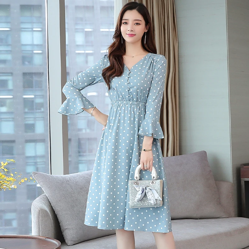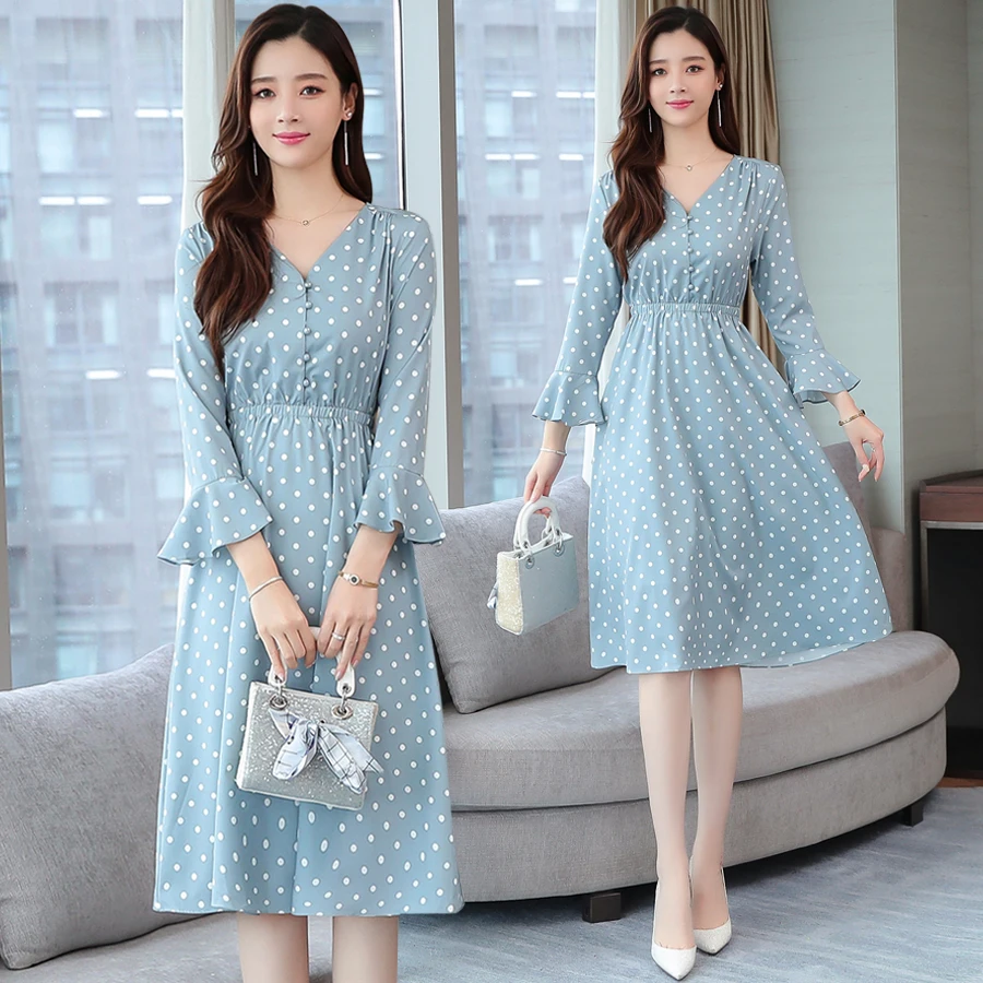 Women Midi Polka Dot Slim Blue Dress Autumn Spring Long Sleeve Vintage Casual Work Lady Dress Korean Elegant Runway Vestidos look the best product that related to